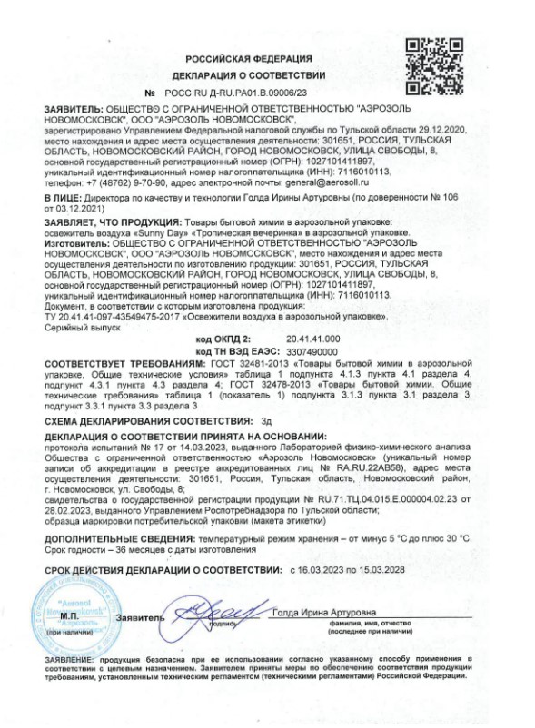 Декларация о соответствии №РОСС RU Д-RU.РА01,В.09006-23