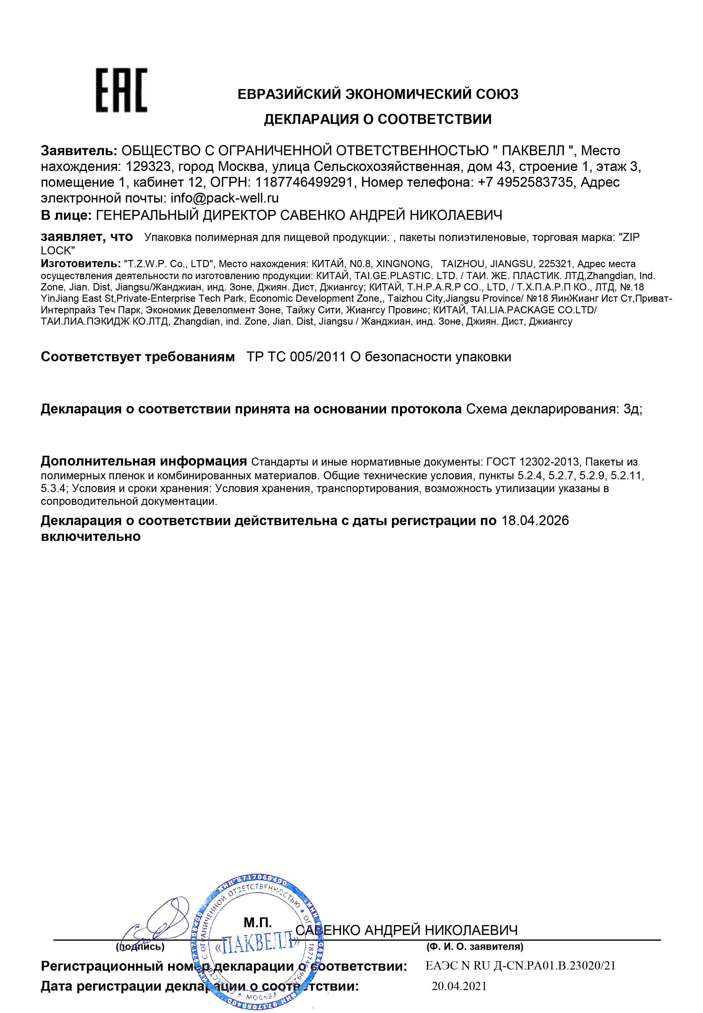 Декларация о соответствии №ЕАЭС N RU Д-CN.РА01.В.23020-21